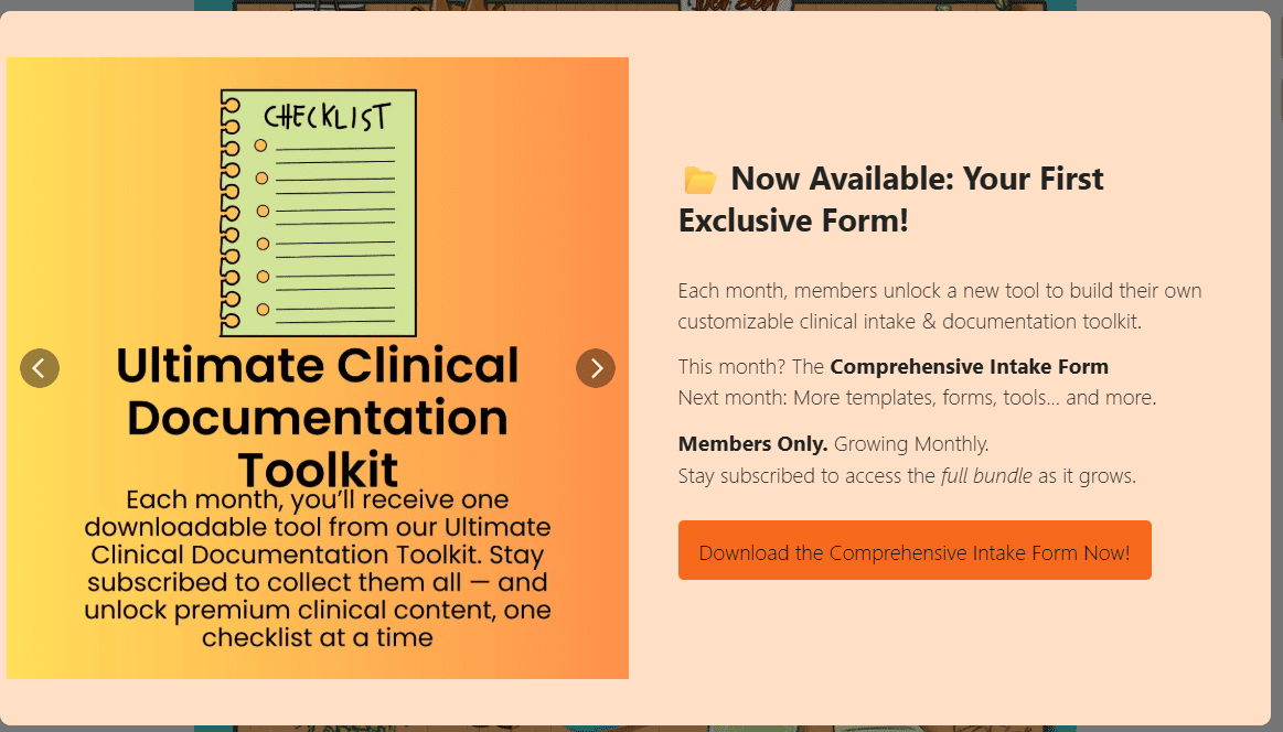 The first release from our Ultimate Clinical Documentation Toolkit, this customizable Comprehensive Intake Form helps streamline the client onboarding process in outpatient mental health settings. Designed for adaptability, it includes sections for demographics, presenting concerns, treatment goals, and relevant history — all in an easy-to-complete format. Ideal for clinicians seeking to save time while gathering a complete clinical picture from the very first session.