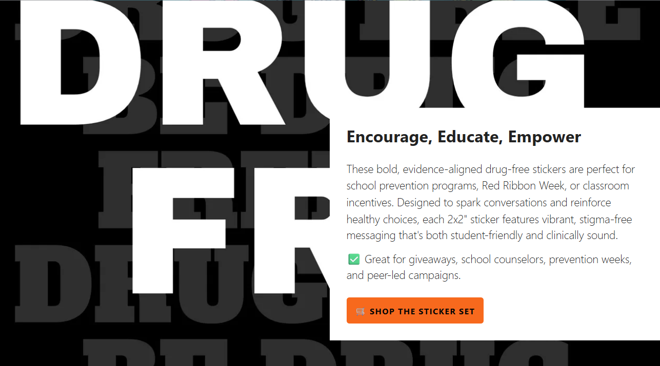 These bold, evidence-aligned drug-free stickers are perfect for school prevention programs, Red Ribbon Week, or classroom incentives. Designed to spark conversations and reinforce healthy choices, each 2×2″ sticker features vibrant, stigma-free messaging that’s both student-friendly and clinically sound.