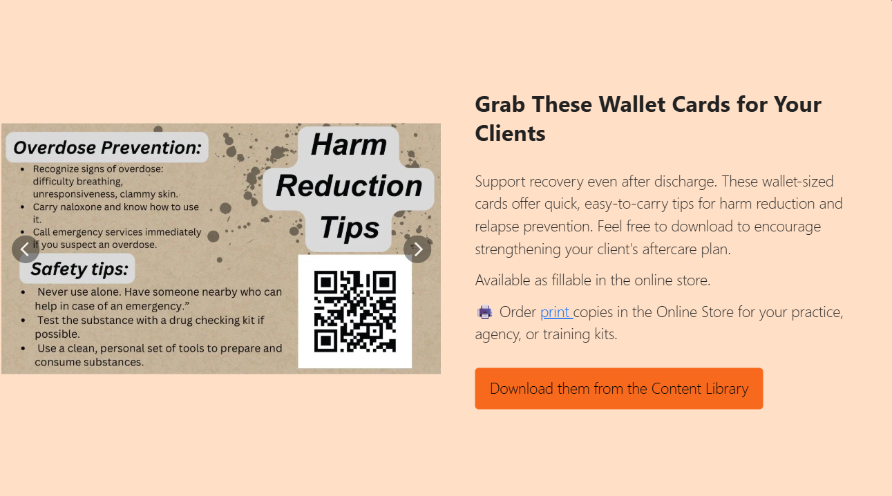 Support recovery even after discharge. These wallet-sized cards offer quick, easy-to-carry tips for harm reduction and relapse prevention. Feel free to download to encourage strengthening your client’s aftercare plan.