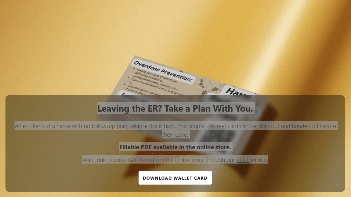 This hotspot highlighted a harm reduction discharge tool — a discreet wallet card that can be filled out before clients leave the ER. Designed to address the high relapse risk when clients leave without a follow-up plan, the resource provides space for essential contacts, next steps, and overdose prevention reminders. Available as a fillable PDF in the online store, with bulk printing through the POD service.