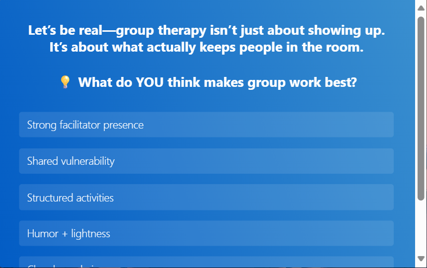 A blue poll-style graphic with the heading: “Let’s be real—group therapy isn’t just about showing up. It’s about what actually keeps people in the room.” Below it, a light bulb icon precedes the question: “What do YOU think makes group work best?” Four blue buttons follow, listing options: “Strong facilitator presence,” “Shared vulnerability,” “Structured activities,” and “Humor + lightness.” A scroll bar is visible on the right, indicating more options below.