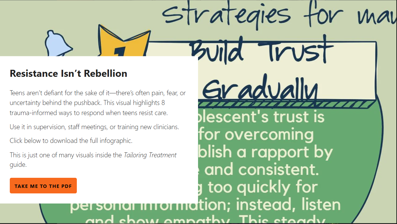 Teens aren’t defiant for the sake of it—there’s often pain, fear, or uncertainty behind the pushback. This visual highlights 8 trauma-informed ways to respond when teens resist care.