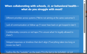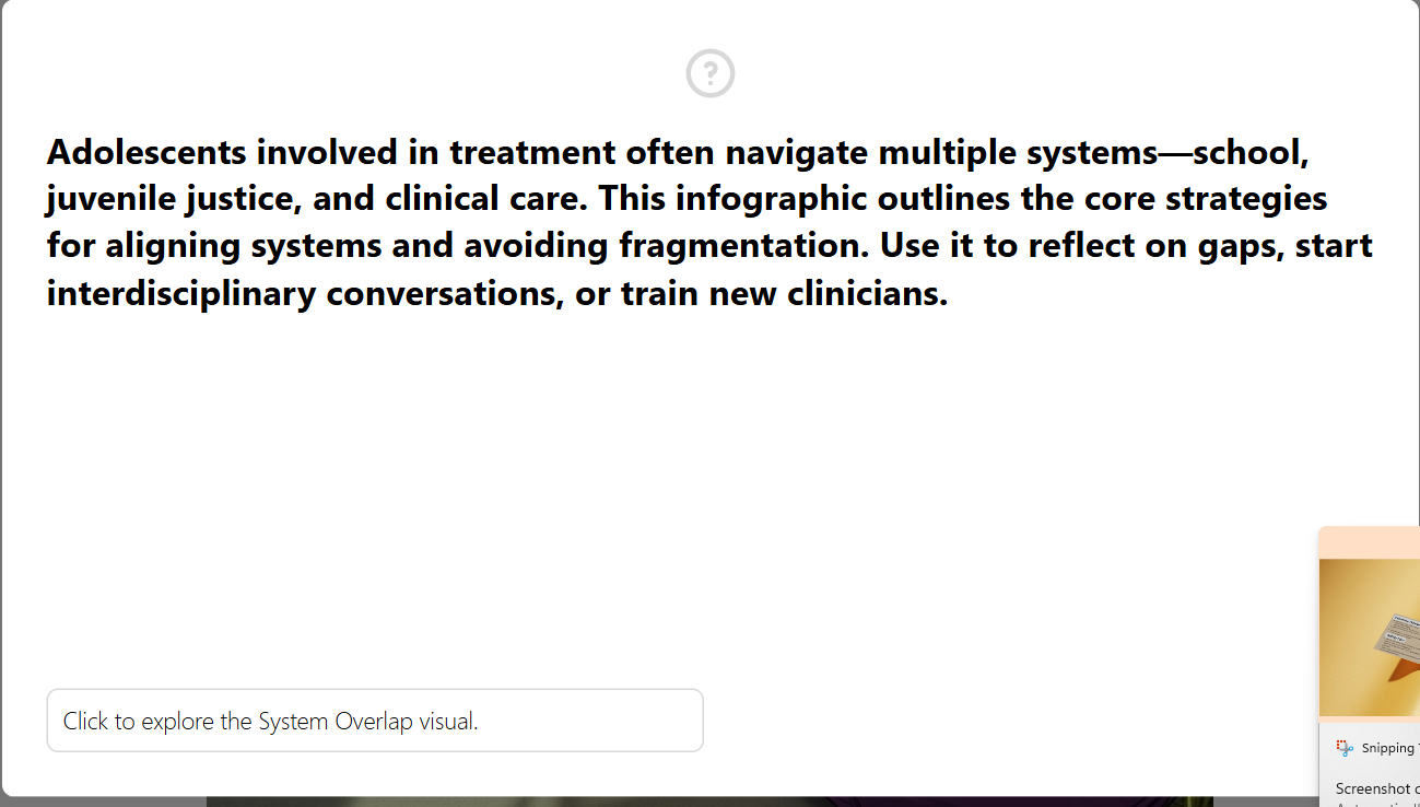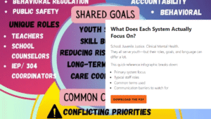 Adolescents involved in treatment often navigate multiple systems—school, juvenile justice, and clinical care. This infographic outlines the core strategies for aligning systems and avoiding fragmentation. Use it to reflect on gaps, start interdisciplinary conversations, or train new clinicians. Transition to new scene.