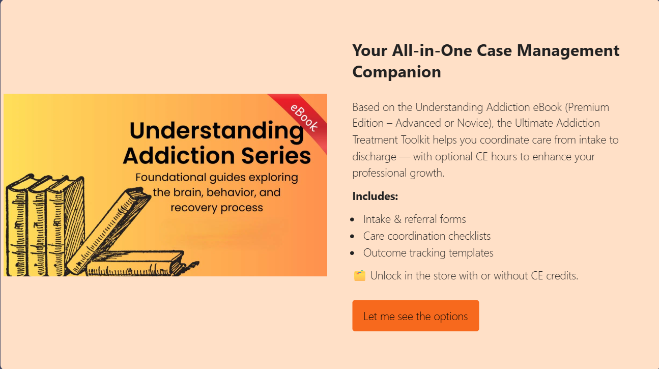 Based on the Understanding Addiction eBook (Premium Edition – Advanced or Novice), the Ultimate Addiction Treatment Toolkit helps you coordinate care from intake to discharge — with optional CE hours to enhance your professional growth.
