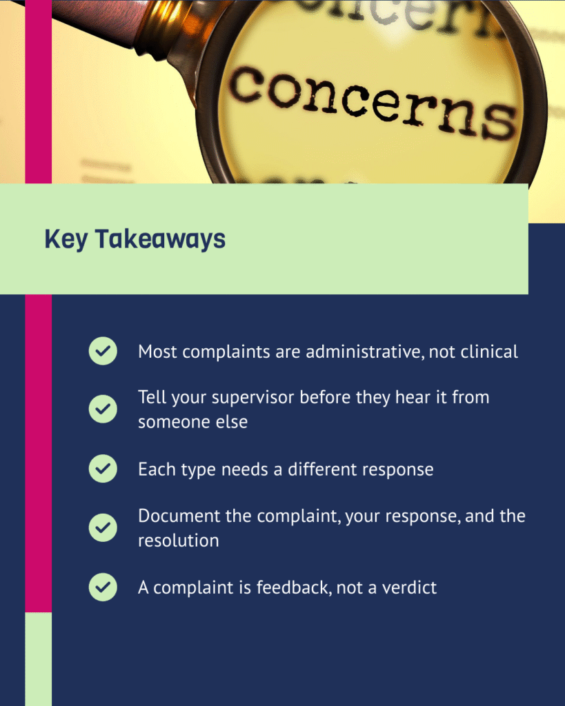 Tell your supervisor before they hear it from someone else. When a client complaint lands on your supervisor’s desk this is the most important thing you can do. Walk in and say: “I need to let you know about a situation with a client.” Give them the facts. What happened, what you’ve already done, what the client or family is saying. Supervisors who get blindsided handle complaints worse than supervisors who are looped in early. And if your supervisor is someone you can’t trust with this ā that’s a bigger problem, and we’ve talked about that too.