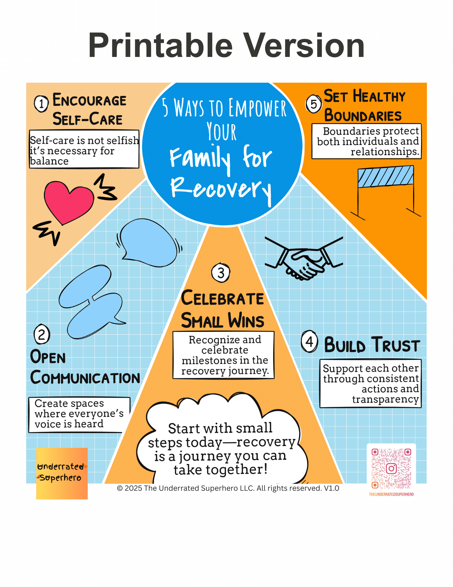 This infographic highlights five supportive strategies families can use to strengthen their role in a loved one’s recovery. It encourages communication, trust-building, healthy boundaries, and the celebration of small progress milestones. Ideal for family-focused sessions or support group education.