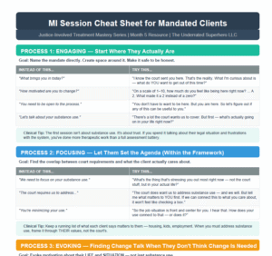 Clinicians who use MI but struggle to adapt it for clients who are court-ordered into treatment. Ideal for new counselors building their MI skills with mandated populations, or experienced clinicians who want a quick refresher they can keep on their desk between sessions.
