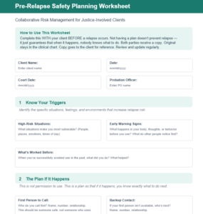 Not having a plan doesn’t prevent relapse. It just guarantees that when it happens, nobody knows what to do. That’s the line from the blog, and this worksheet is the answer to it. Most clinicians wait until after a relapse to figure out a response ā and by then they’re reacting instead of responding. This tool flips that. You sit down with your client when things are stable, walk through each section together, and build a plan that’s ready to go if things fall apart. The court conversation section is especially critical ā your client writes out what they’ll say to their PO before they need to say it, which changes the entire dynamic from panic to preparation. Print it or fill it digitally in session, give the client a copy, and keep the original in the chart.
