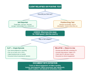 A two-page visual flowchart that walks you through exactly what to do the moment a client relapses or returns a positive drug test. Starting from the initial discovery, the decision tree branches based on whether the client self-reported or tested positive, guides you through the clinical assessment, and then splits again based on whether you’re dealing with a slip or a full relapse. Each branch leads to specific clinical actions so you’re never guessing what comes next. Page two is a quick reference companion with the key questions you should be asking at every decision point in the process.