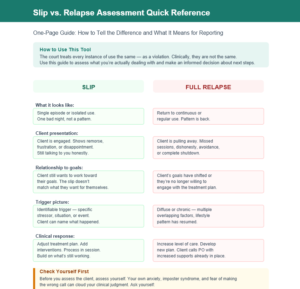 The court doesn’t differentiate between a slip and a relapse. You have to. This tool exists because new counselors often default to one of two extremes ā over-reporting every instance of use because they’re afraid of getting in trouble, or under-reporting because they don’t want to damage the relationship. Both responses come from fear, not clinical reasoning. This quick reference gives you a structured way to assess what you’re actually dealing with, check your own bias before you act, and make a reporting decision you can defend in supervision. Print it double-sided and keep it in your desk for the moments when you need to think clearly and don’t have time to second-guess yourself.