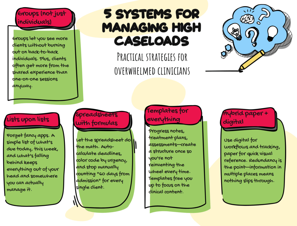 Here’s what nobody tells you about high caseloads: the sessions aren’t the hard part. I loved my groups. I was good at them. The clients showed up because I had solid relationships with them.