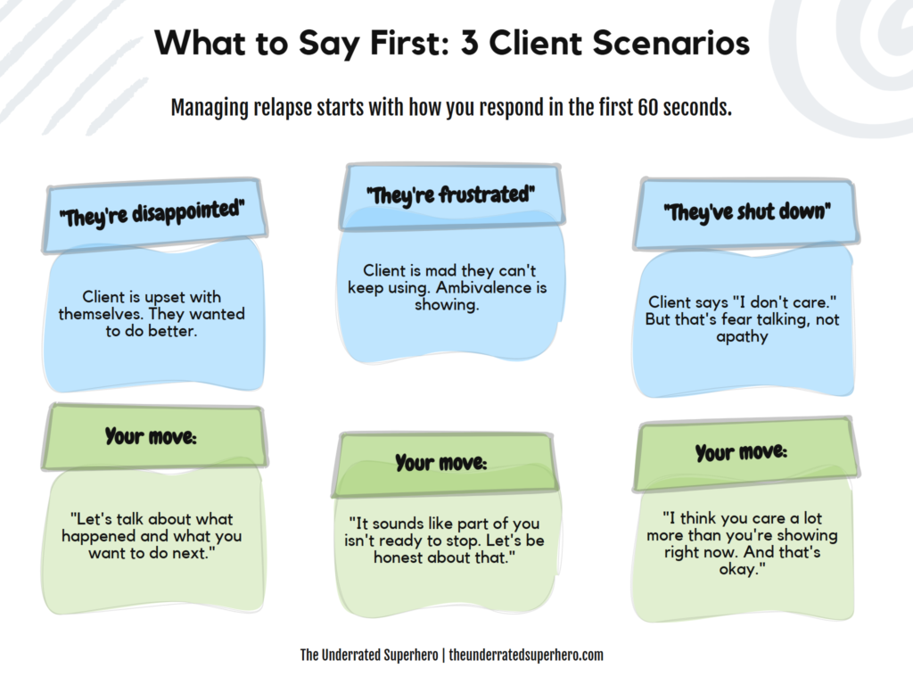 The shift: “I relapsed” is a confession. “I relapsed and here’s what I’m doing about it” is accountability. Help your client get to the second version before they ever pick up the phone.
