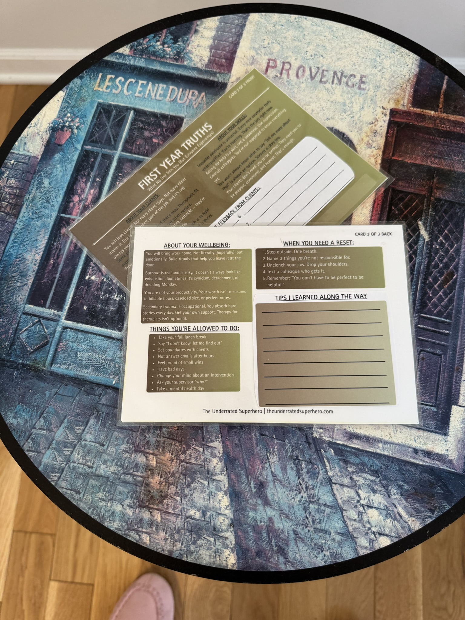 You don’t need more tabs to open — you need everything in one place. This complete desk system builds on the Professional Edition with a full-size reference mat that sits under your keyboard. Session scripts, group prep, grounding techniques, crisis numbers, and a sticky note zone for what needs your attention today – plus two structured sticky note pads (‘Follow Up’ and ‘For Next Session’) to keep your priorities organized. No digging through folders. No trying to remember what you read once. Just look down. It’s all there.