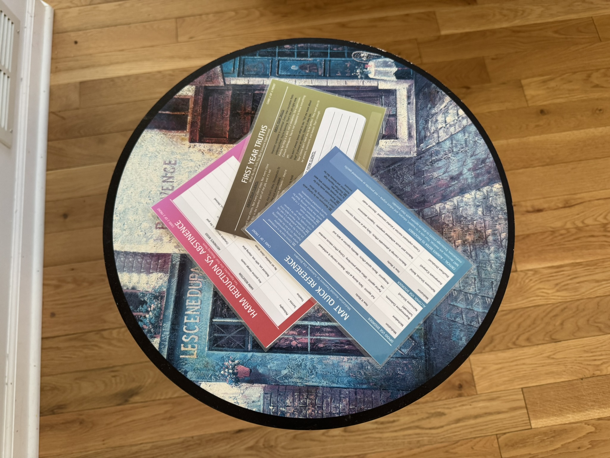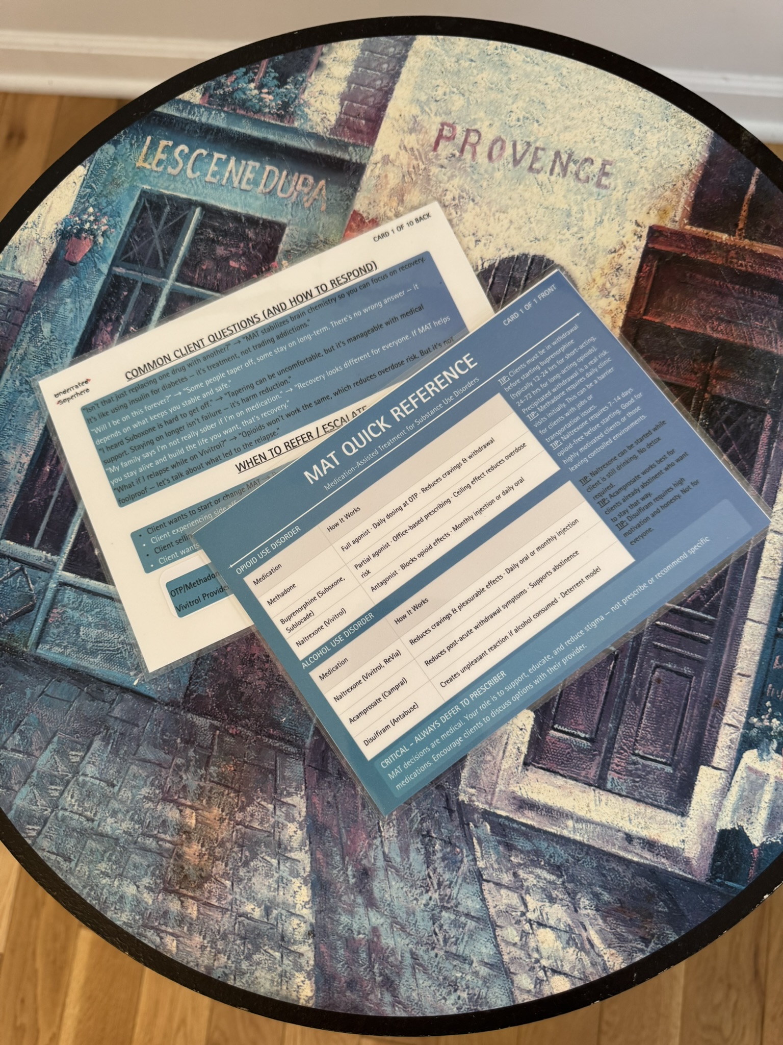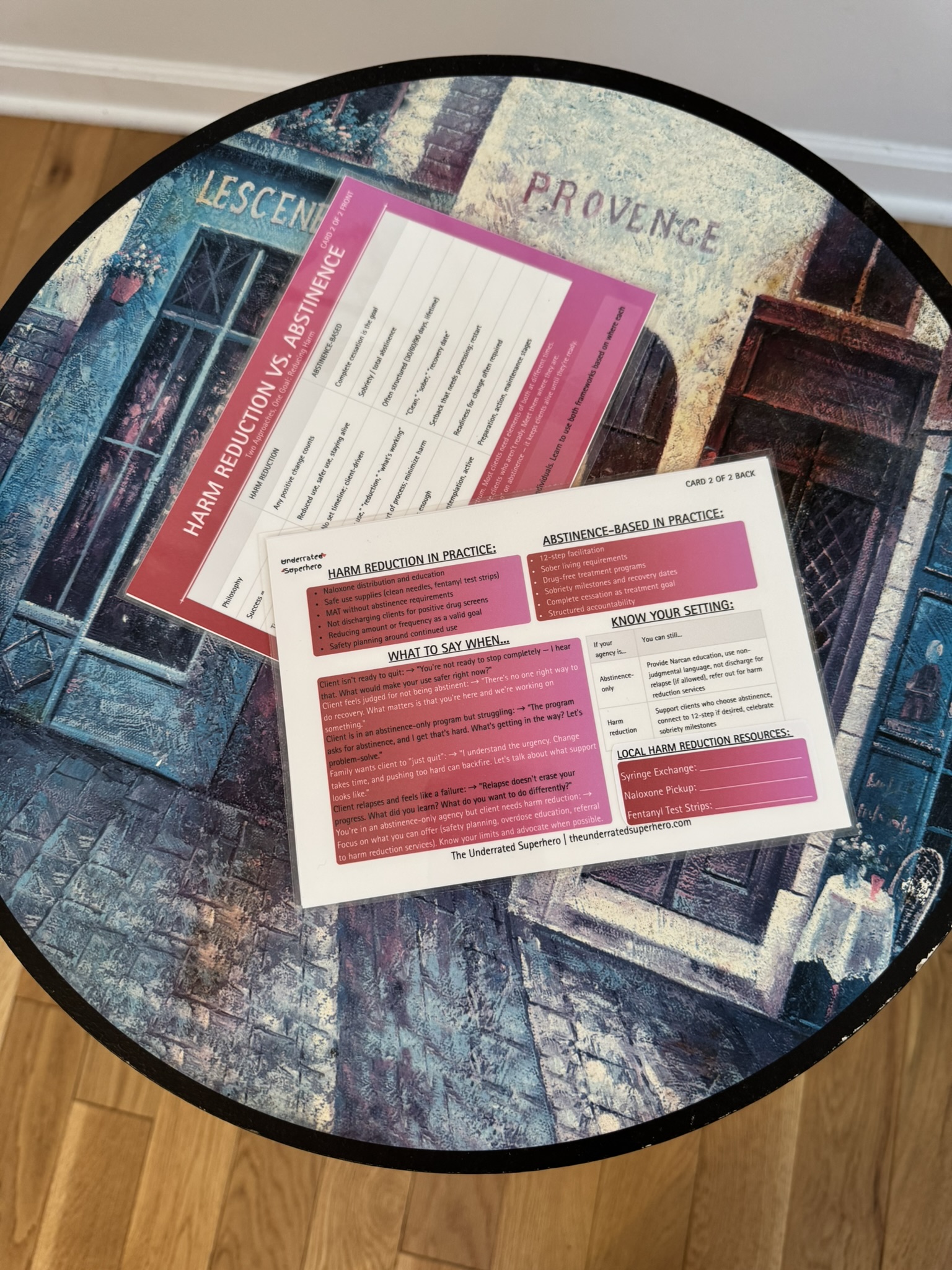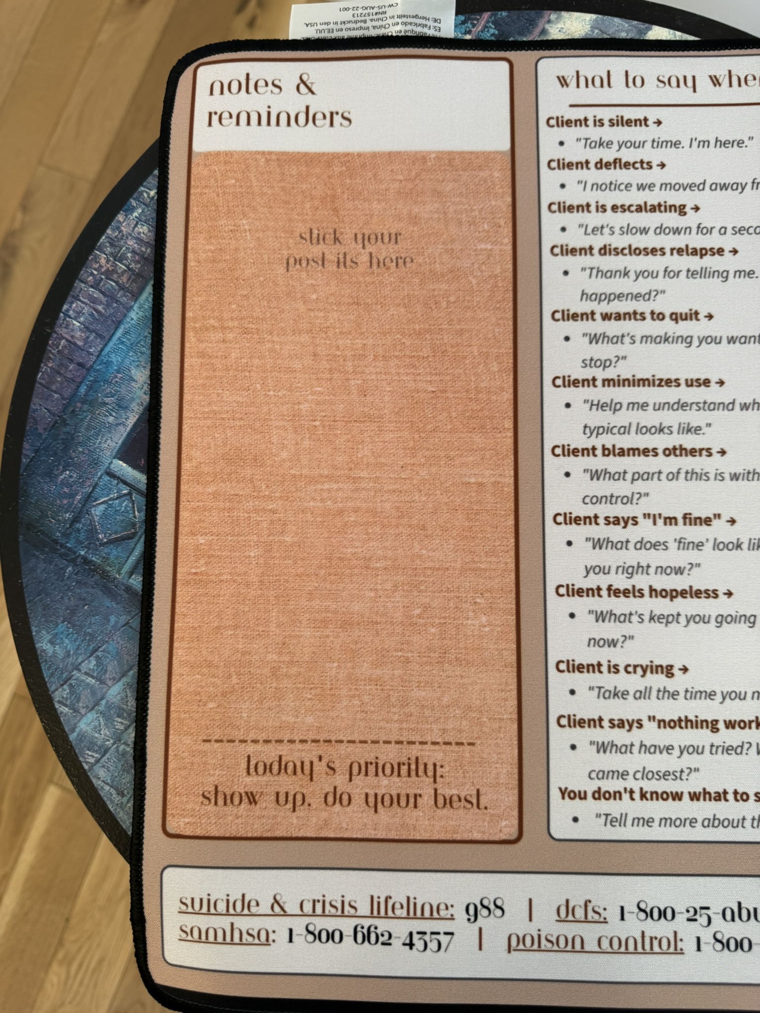 • New Clinician Desk Mat (23.6″ x 13.8″) — session scripts, group prep, HALT, grounding, crisis numbers, sticky note zone